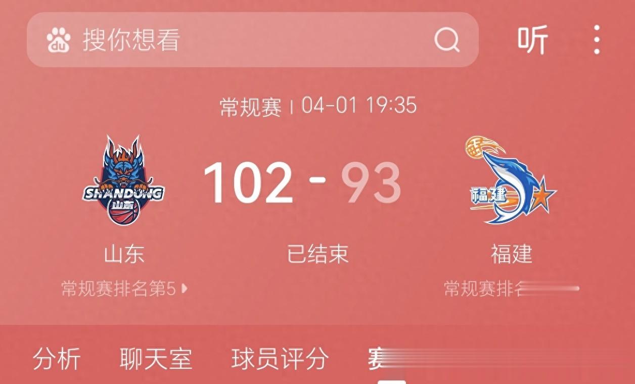 4月1日,山东省体育中心,102-93,山东高速男篮主场战胜福建,以21胜11负的战绩重返CBA积分榜前四。