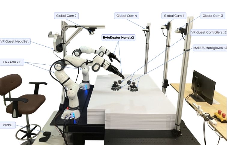 字节跳动Seed通过将MANUS Metagloves 手套作为其数据收集管道中的主要手部动作接口解决了这一难题。将用于手腕姿势跟踪的Meta Quest VR耳机与用于捕捉手指运动细节的MANUS手套相结合,Quest控制器安装在手套背上,以提高协调的手腕-手跟踪的可靠性。