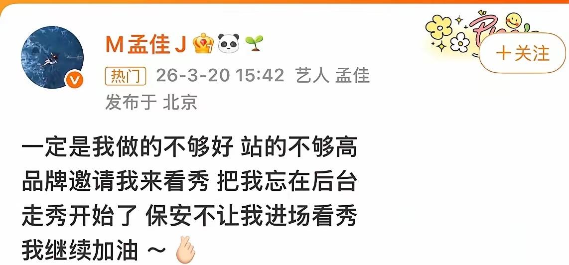 看孟佳的配文都是在暗讽自己做的不够好,不够优秀,被品牌方邀请来看秀却被保安拦住了不让进,实则都是在控诉品牌方责任,自己咖位不够高所以不被重视。