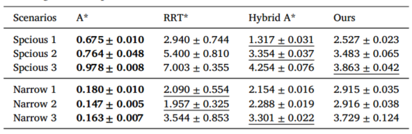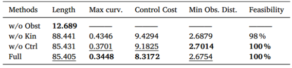他们在两种场景下做了对比:宽敞环境和狭窄环境,各三个子场景,跟A*、RRT*、Hybrid A*比了五项指标:路径长度、最大曲率、平均曲率、控制代价、平均障碍物距离、最小障碍物距离、可行性。