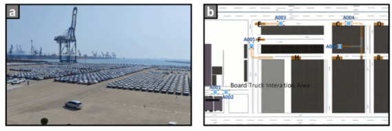 图9.烟台港堆场作业。 (a) 物理实验环境。 (b) 用于路径可视化和机器人状态的远程监控接口。