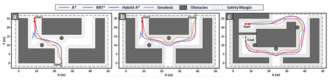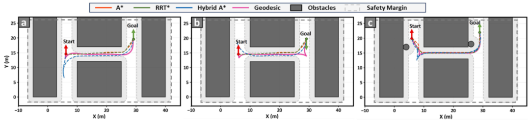 图 7. 狭窄环境中的导航场景。 (a) 前进导航:通过狭窄走廊并进行转弯机动。 (b) 倒车停车:通过狭窄走廊并向后掉头。 (c) 航行受限:走廊较窄,障碍物较多。