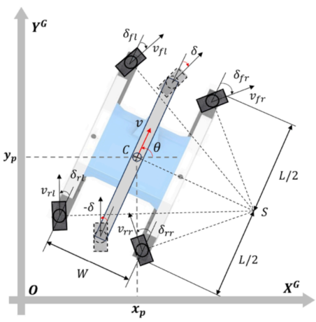 图2. 4WS机器人的运动学模型。