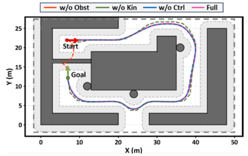 图8和表2是消融实验,分别去掉障碍物、运动约束、转向代价。去掉障碍物,路径直接穿墙;去掉运动约束,路径曲率变大;去掉转向代价,路径还行但更“抖”。说明三个部分各司其职,缺一不可。