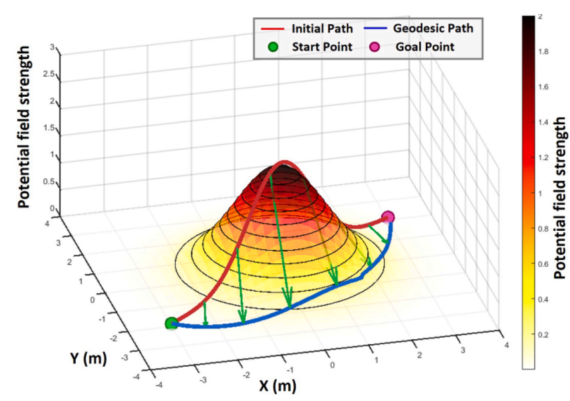 这是最关键的一层。他们把障碍物(矩形、圆形)用势函数表示,离障碍物越近,势能越高。把这个势能乘到整个度量上,意味着在障碍物附近,所有方向的“行走成本”都变高,测地线自然会绕着走。