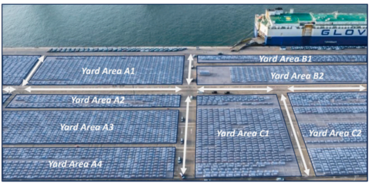 图1. 滚装船堆场车辆存放作业场景示意图。