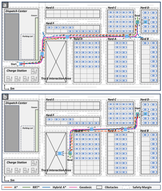 图 11. 机器人操作场景的真实实验。 (a)取车场景:转运机器人从充电站移动至堆场取回商用车。 (b) 车辆还车场景:转运机器人将商用车从堆场运送到卡车交互区。