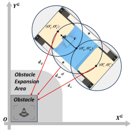 为了快速计算机器人到障碍物的距离,他们还用了个三圆模型把车身包住,每个圆的半径取到刚好覆盖车身轮廓。