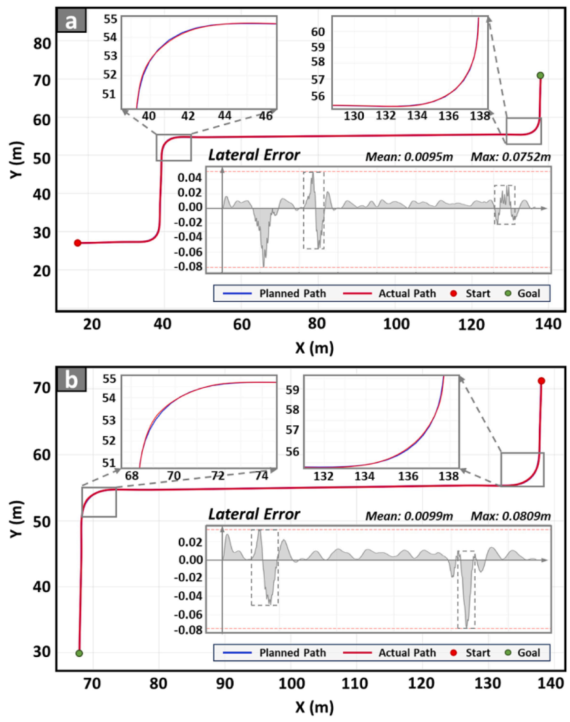 图 12. 现实世界的机器人路径可视化和跟踪误差分析。 (a) 车辆取货场景。 (b) 车辆还车场景。