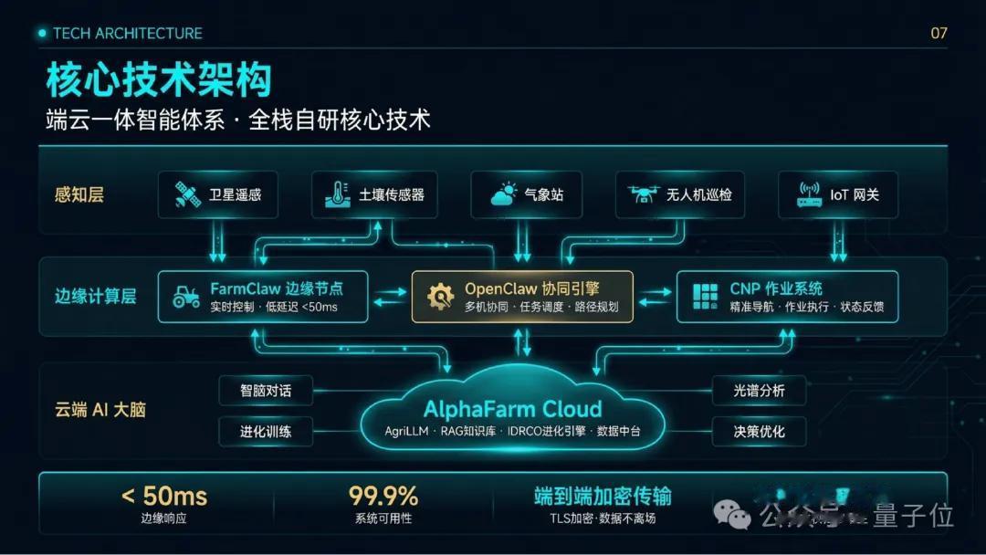 自主决策:意味着系统不只是给出建议,而是直接驱动农机执行。从“今天该不该浇水”到“哪台农机去哪块地”,AlphaFarm的Agent AI会自主生成指令并下发执行,全程无需人工确认; 无人农场:意味着从感知到执行的完整闭环。传感器网络负责采集数据,卫星遥感负责宏观监测,农机负责田间作业,AlphaFarm负责把这三者串联成一个有机整体; 自主进化:是整个系统里最让人震撼的部分。AlphaFarm内置了一套叫做IDRCO(Iterative Decision-Reinforcement-Cognition-Optimization)的进化引擎。每一次作业结束后,系统会把产量验证结果、作业效率数据、决策准确率反馈回模型,触发新一轮的增量学习。 四大黑科技,逐一拆解黑科技一:AlphaFarm智脑——海量知识块的农业大模型