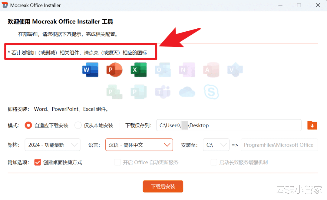 Mocreak就是来解决这个问题的,它是一款绿色工具,集Office下载、安装、激活、卸载于一体,最实用的就是能自定义安装组件。