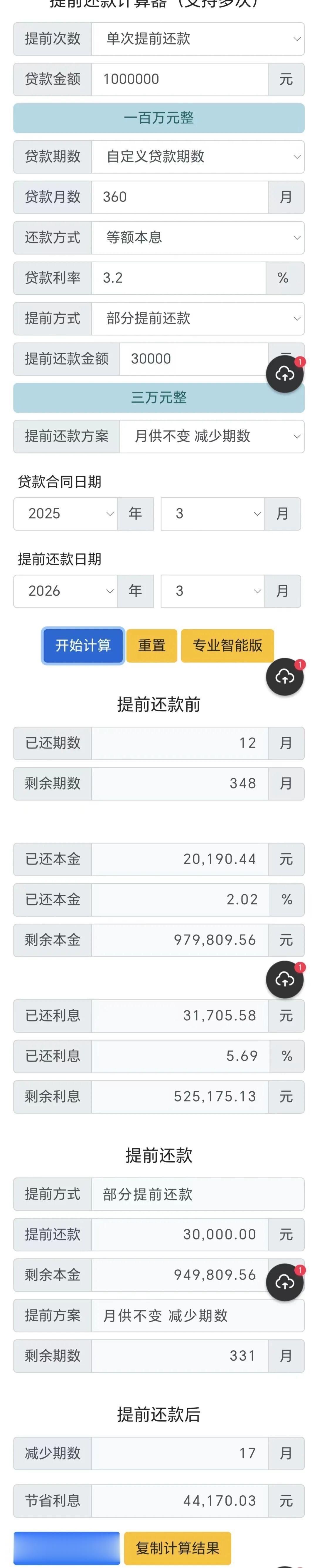 最常见的30年等额本息、利率3.2%,贷款100万,月供约4324元,已还款一年。若是提前还3万本金,选缩短年限、月供不变。