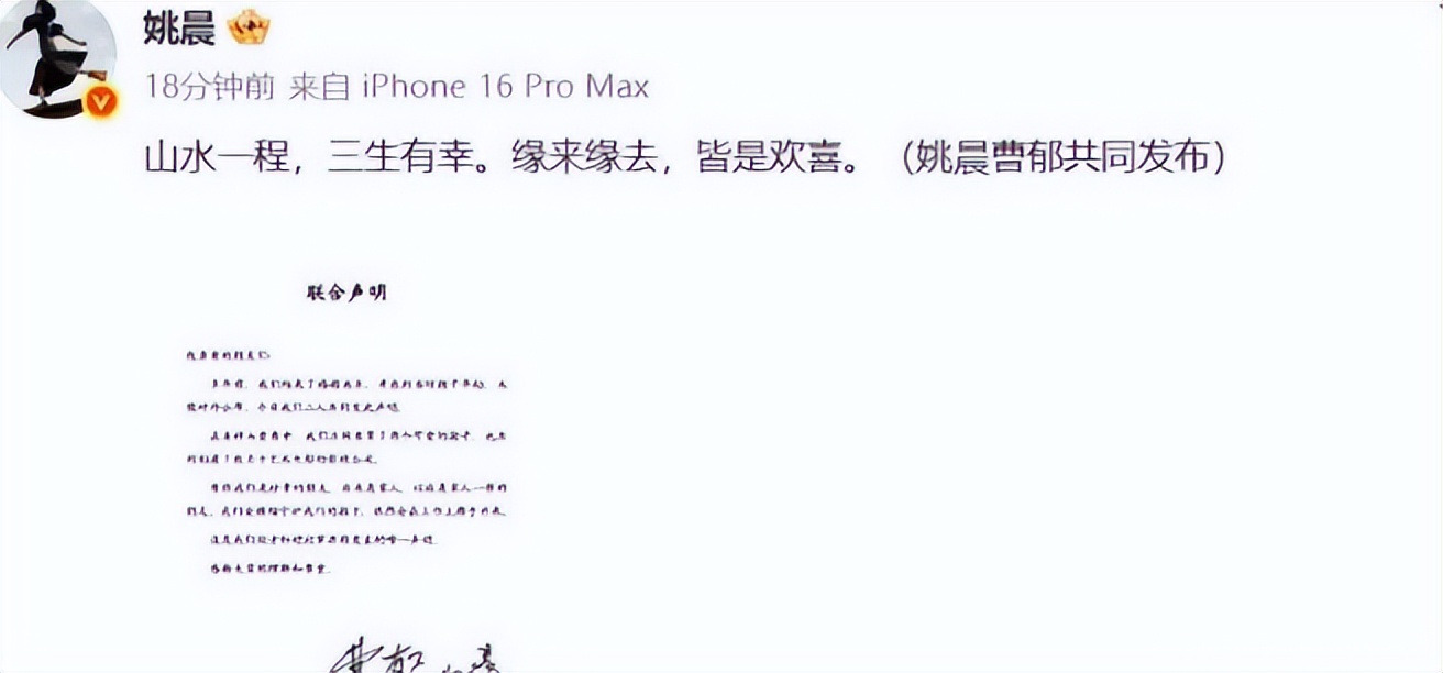 从姚晨的发文来看也能感觉到两人是和平离婚,双方都非常体面。