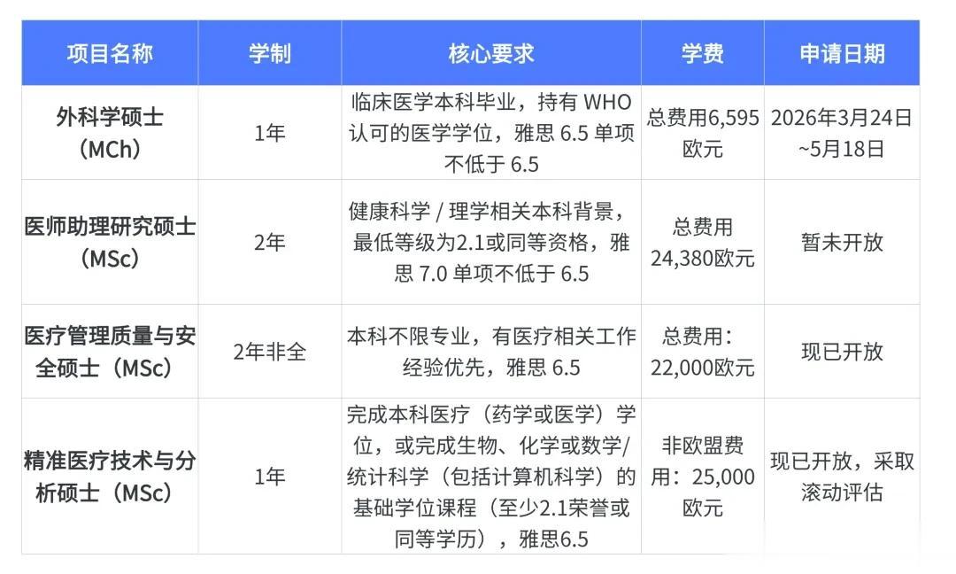 申请通道:通过 RCSI 官网在线申请系统提交,全年滚动招生,多数项目秋季入学。