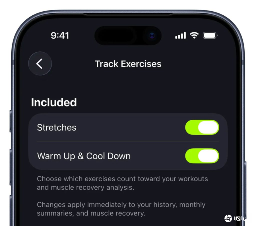 用户可以设置每个阶段的时长,并选择热身和放松是否计入其训练和肌肉恢复分析。