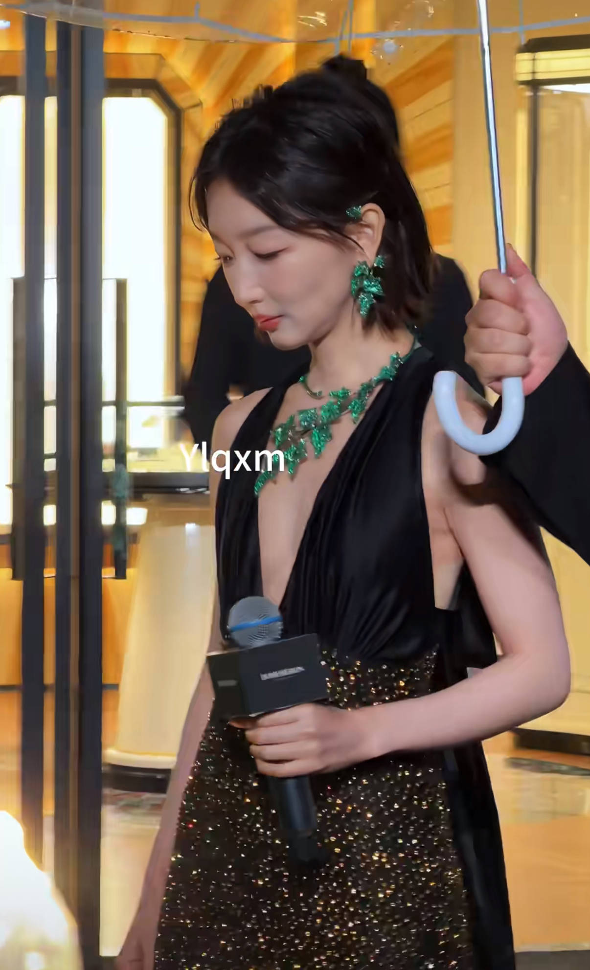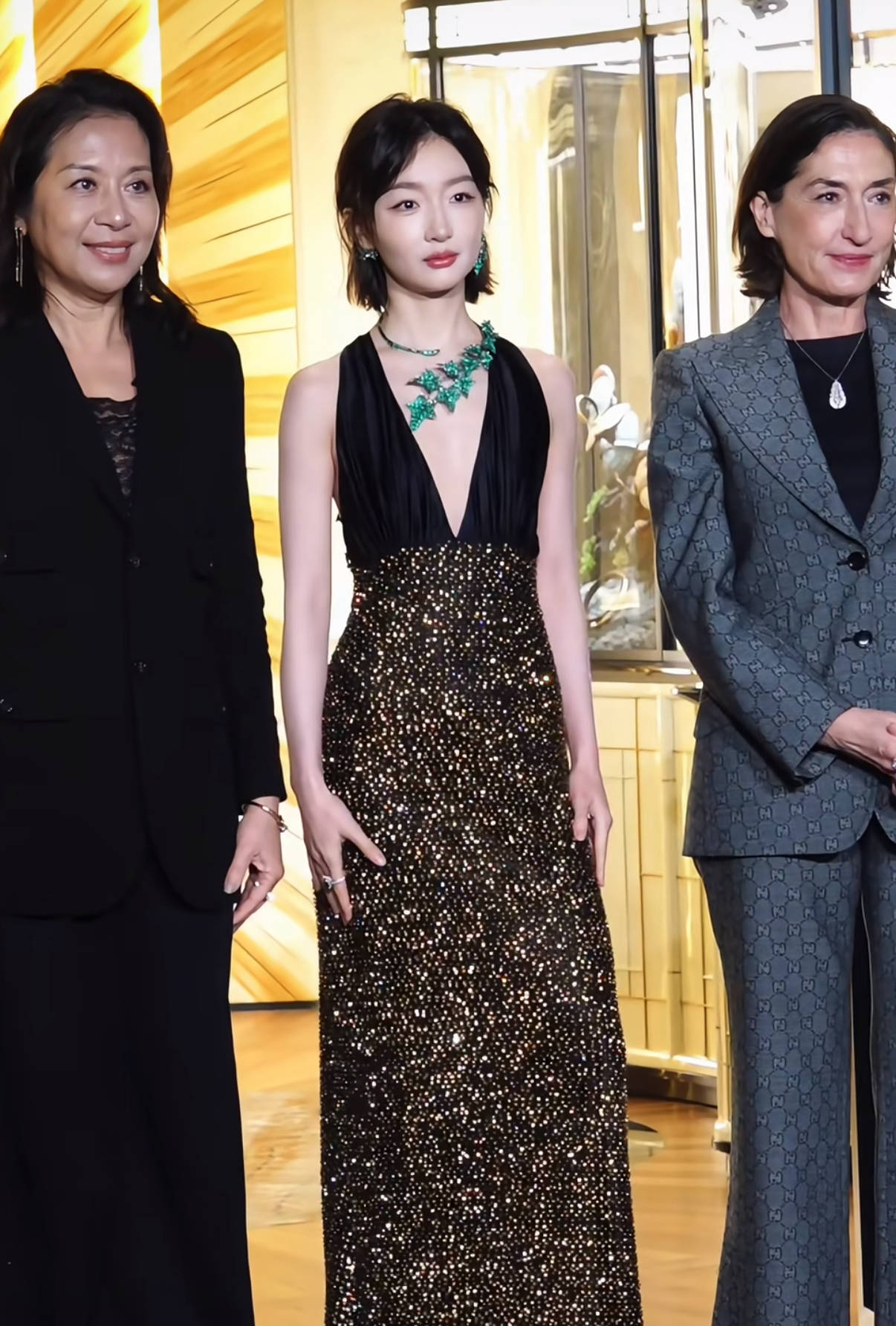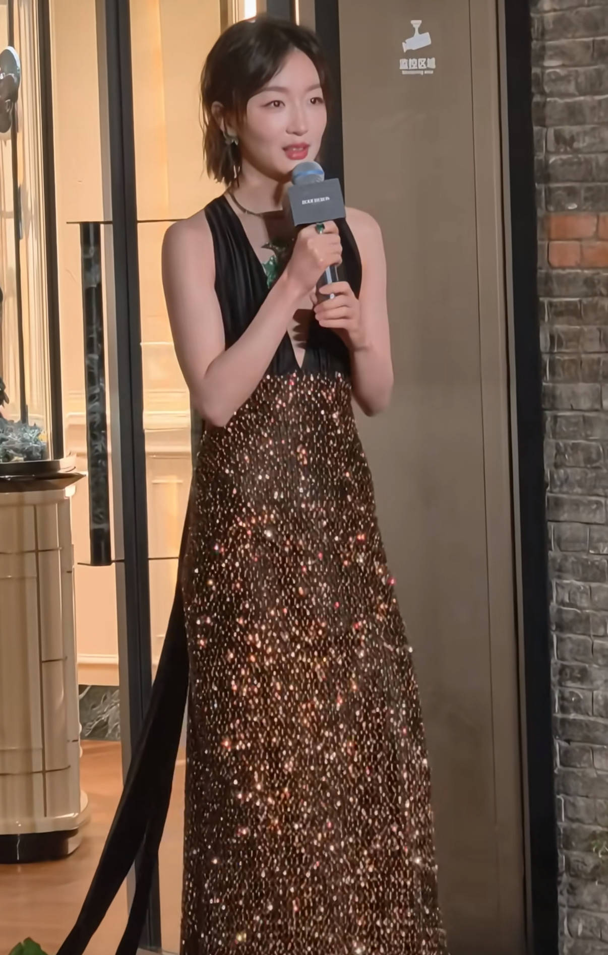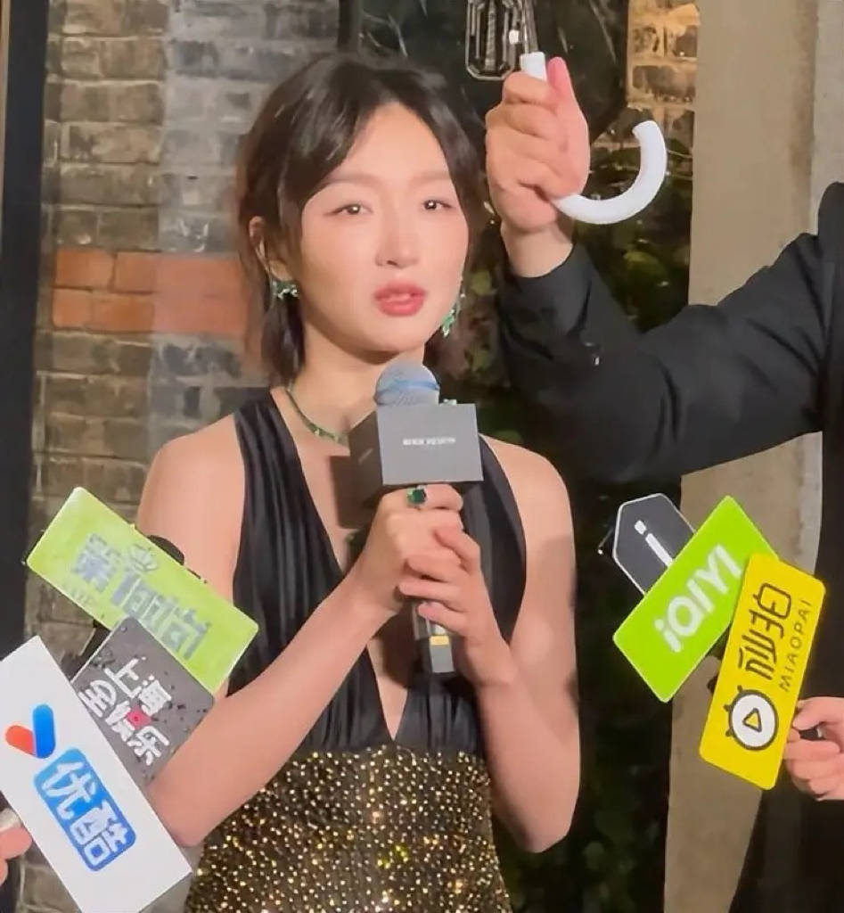 周冬雨再次“真空上阵”,穿了一件深V领的闪片长裙。