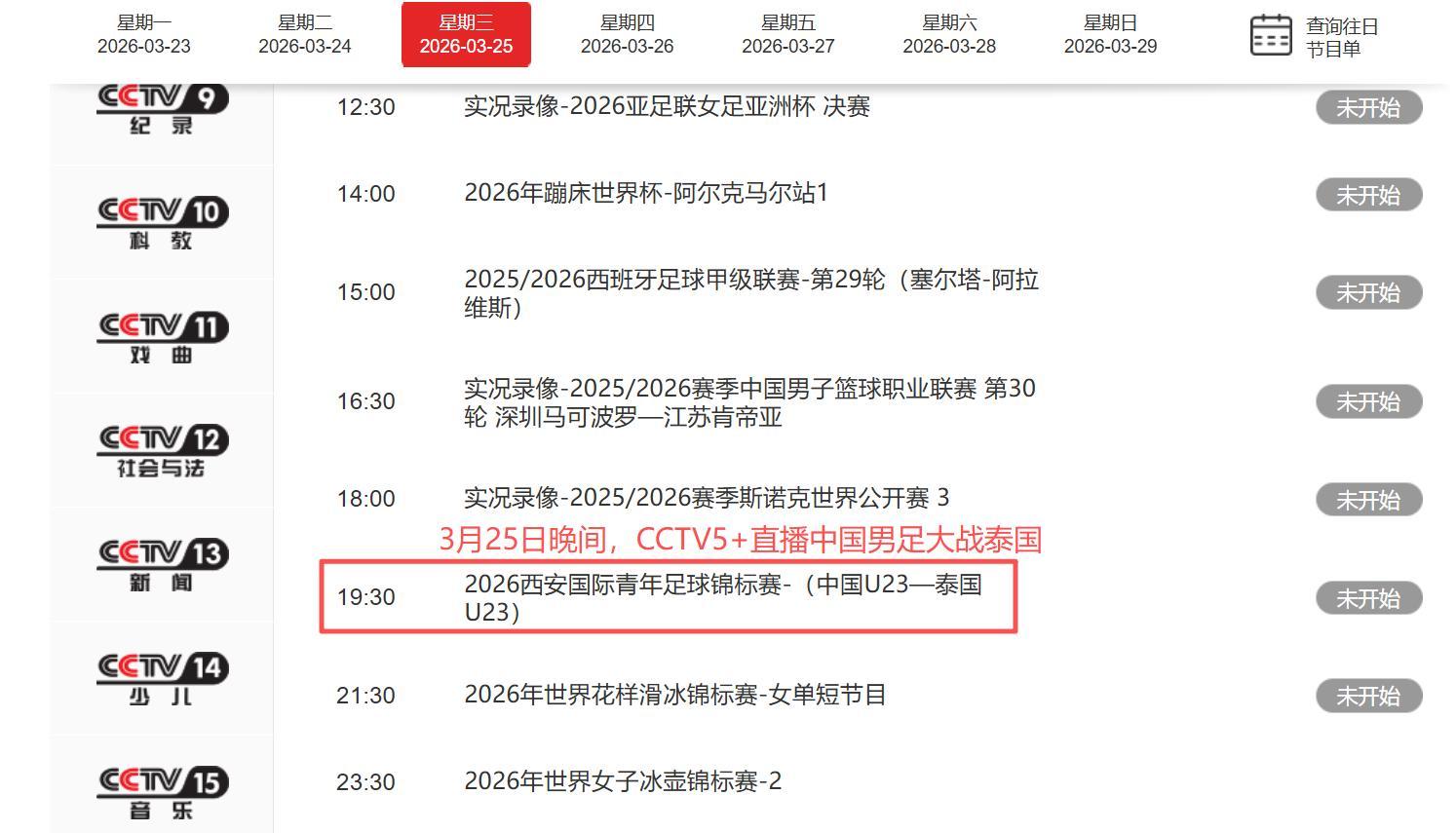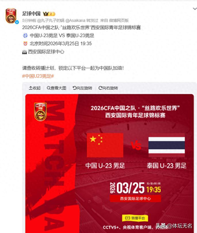中央5台的安排也已经出炉,晚间19点30,CCTV5+全程直播中国男足U23大战泰国,球迷们可以在电视机前为我们的年轻球员加油助威!