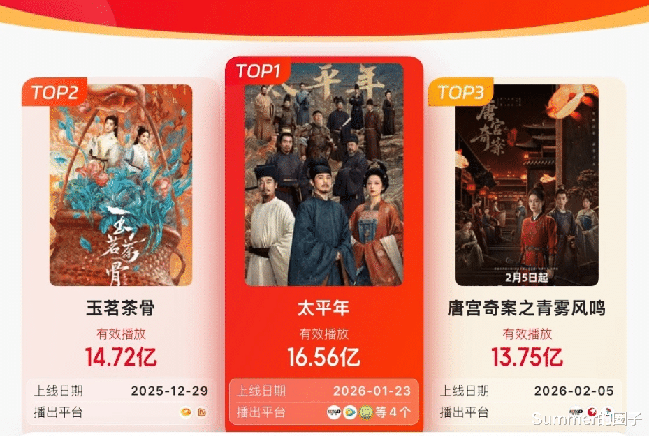 白鹿的《唐宫奇案》是2026年上线的作品中第一部热度破万的剧,但是优酷的热度破万含金量一向不高,热播期云合集均2400万,第一季排名第二,不过这个数据是白鹿近五年,除《北上》之外,个人最差集均播放量,所以对她来说,也没有新增影视实绩。