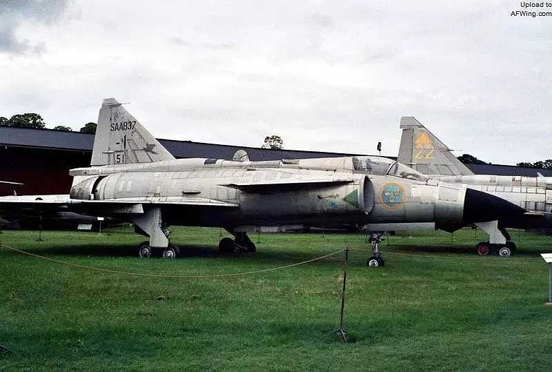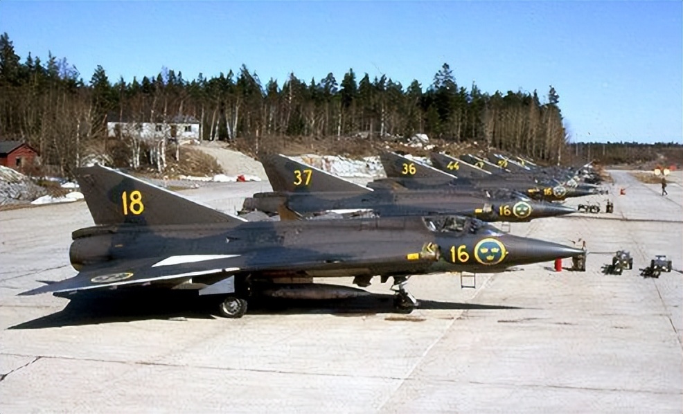 萨博-37“雷”式战机1971年开始服役,采用三角翼鸭式布局,配备推力换向器,能在普通公路上仅滑行400米即可起飞,着陆滑跑距离更是缩短到500米以内。