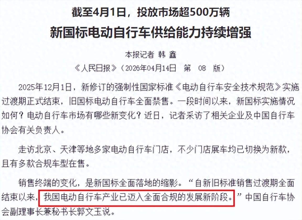 4月14日,人民日报第08版报道了新国标电动车的消息,截止到2026年4月1日,新国标电动车已投放市场超过500万辆。