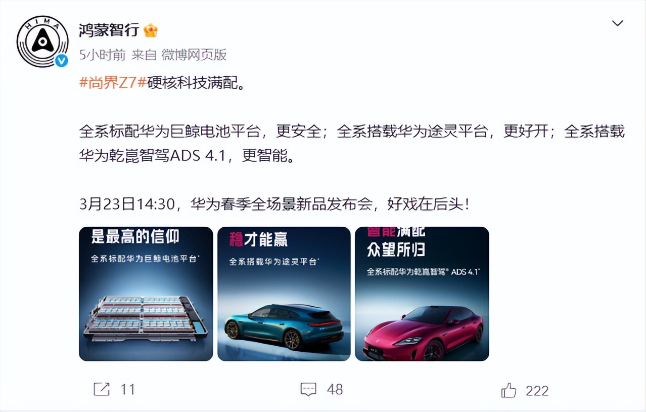 作为鸿蒙智行布局年轻智能出行市场的重磅车型,尚界Z7以三大华为核心平台全系满配的诚意,打破同级车型“高配才有高端技术”的惯例,实现安全、驾控、智能三大核心体验全面越级。3月23日14:30,华为春季全场景新品发布会将正式揭晓该车更多细节。