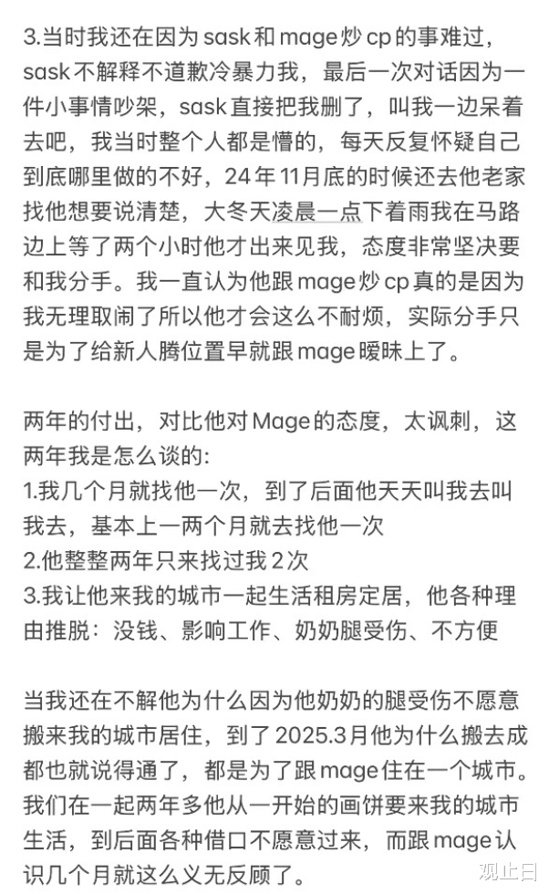 据她描述,两人谈了两年恋爱,几乎都是她去Sask的城市,想让他来一次都是奢望。结果分手后,Sask扭头就去了成都定居——那个正在和他炒CP的Mage所在的城市。