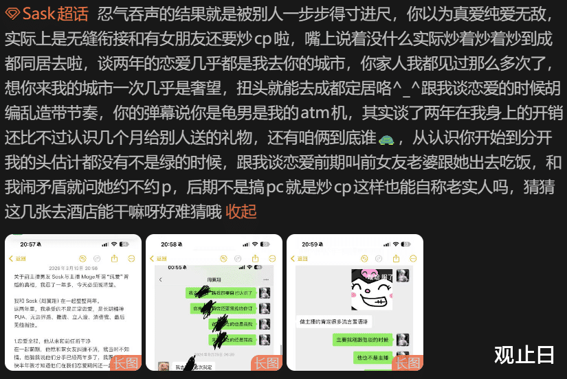 “Sask不是刚和Mage官宣吗?这前女友是来拆台的?”“两年恋爱开销不如几个月,这也太真实了。”“PC?炒CP?无缝衔接?Sask这个人设崩得有点快啊。”“建议严查聊天记录,如果是真的,那Sask这波确实没得洗。”