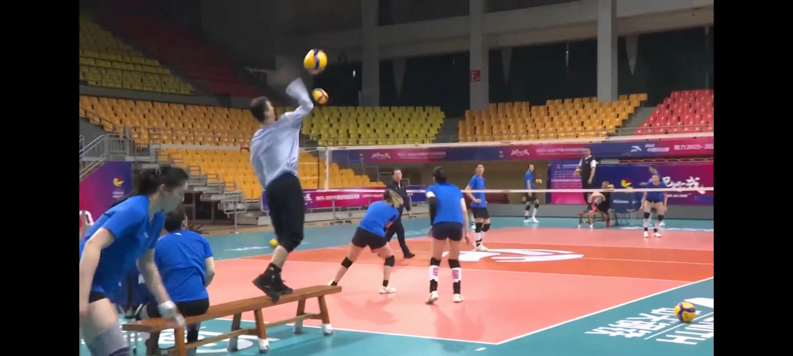 江苏女排赛前训练,还特意提高了的发球的高度,教练员站在凳子上发球增加发球的速度和难度,来训练提高江苏女排的一传保障能力!
