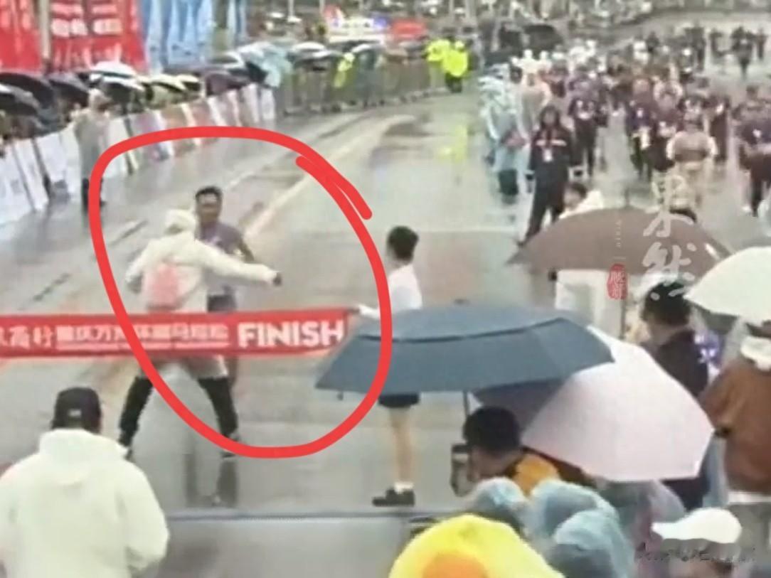 回看现场画面,盛雪李在即将撞线时,身着雨衣的裁判突然冲出,将其拦停并推向半马赛道区域。