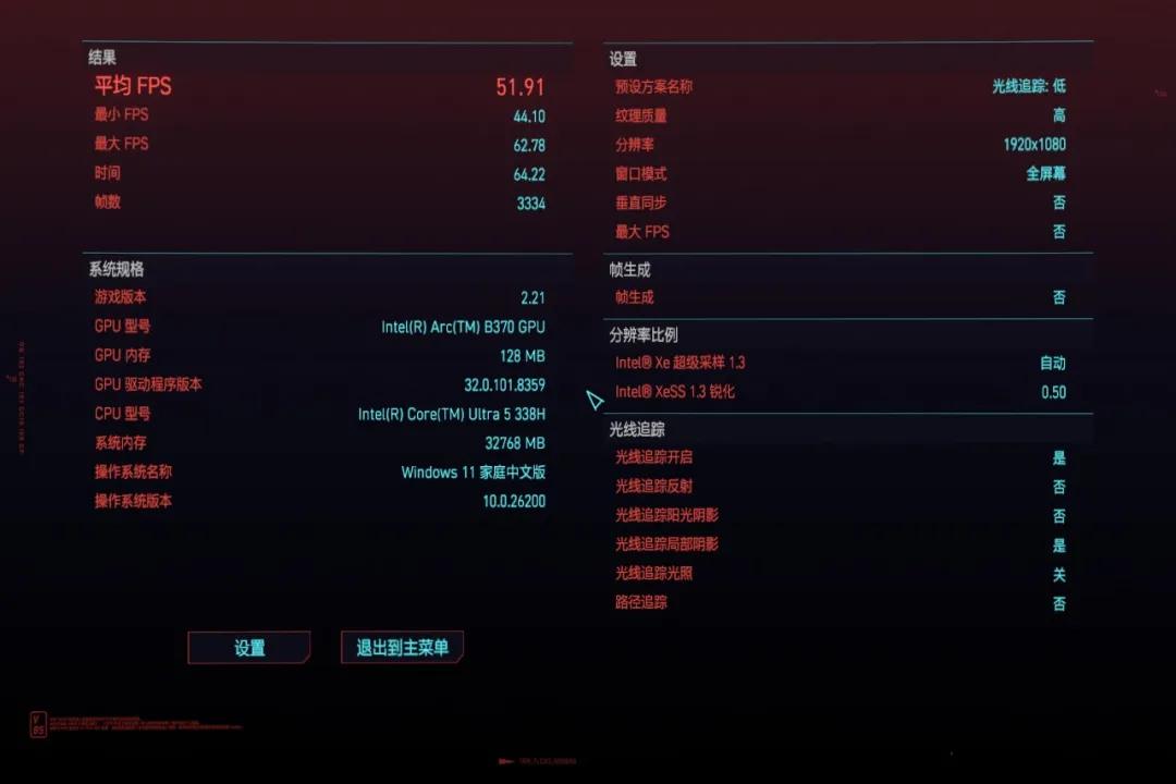 如果将分辨率降到1080P,即便开启高画质+光线追踪,也能稳定50 FPS以上,足以打破“轻薄本不能玩3A游戏”的固有印象。当然,要是你画质和帧率都想要,那还是老老实实选择游戏本吧。