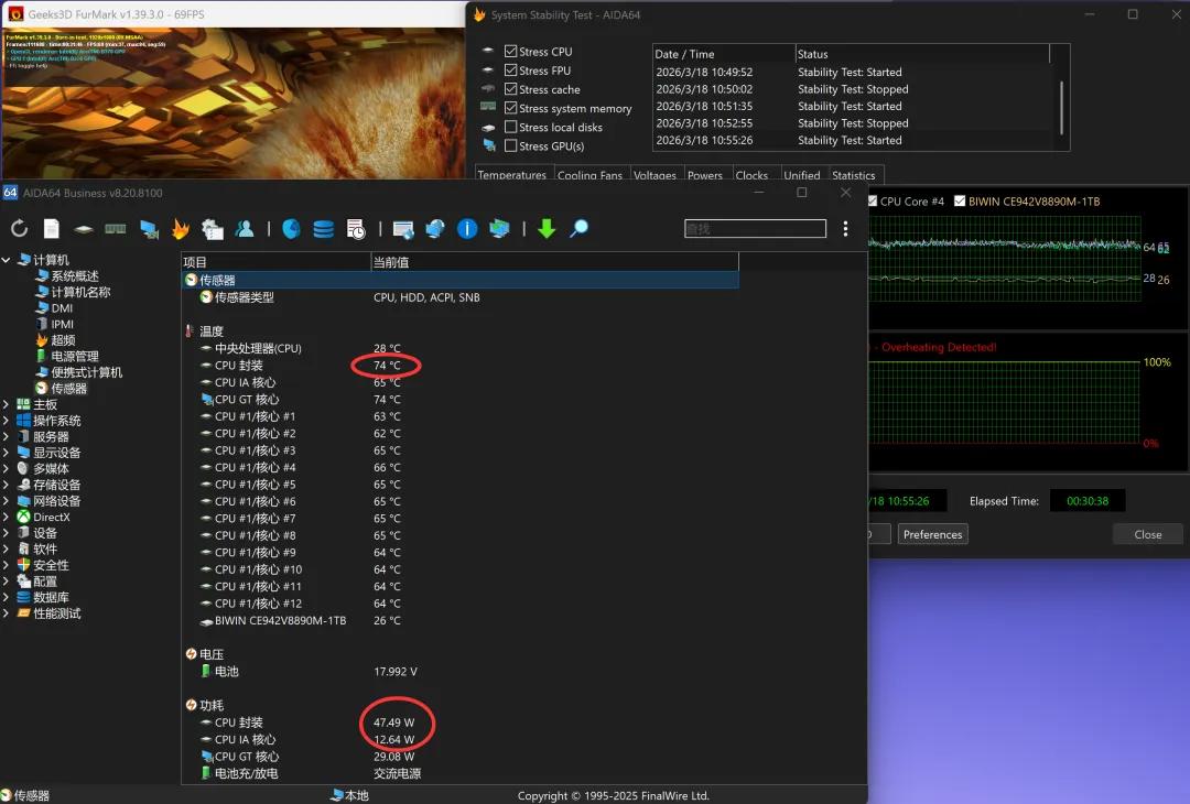 为了试探它的极限水平,我开启了AIDA64和FurMark双“烤鸡”——实测半小时,功耗能稳定在47W以上,接近满载状态,CPU持续100%负载运行,没有死机或者降频,保持着稳定输出。