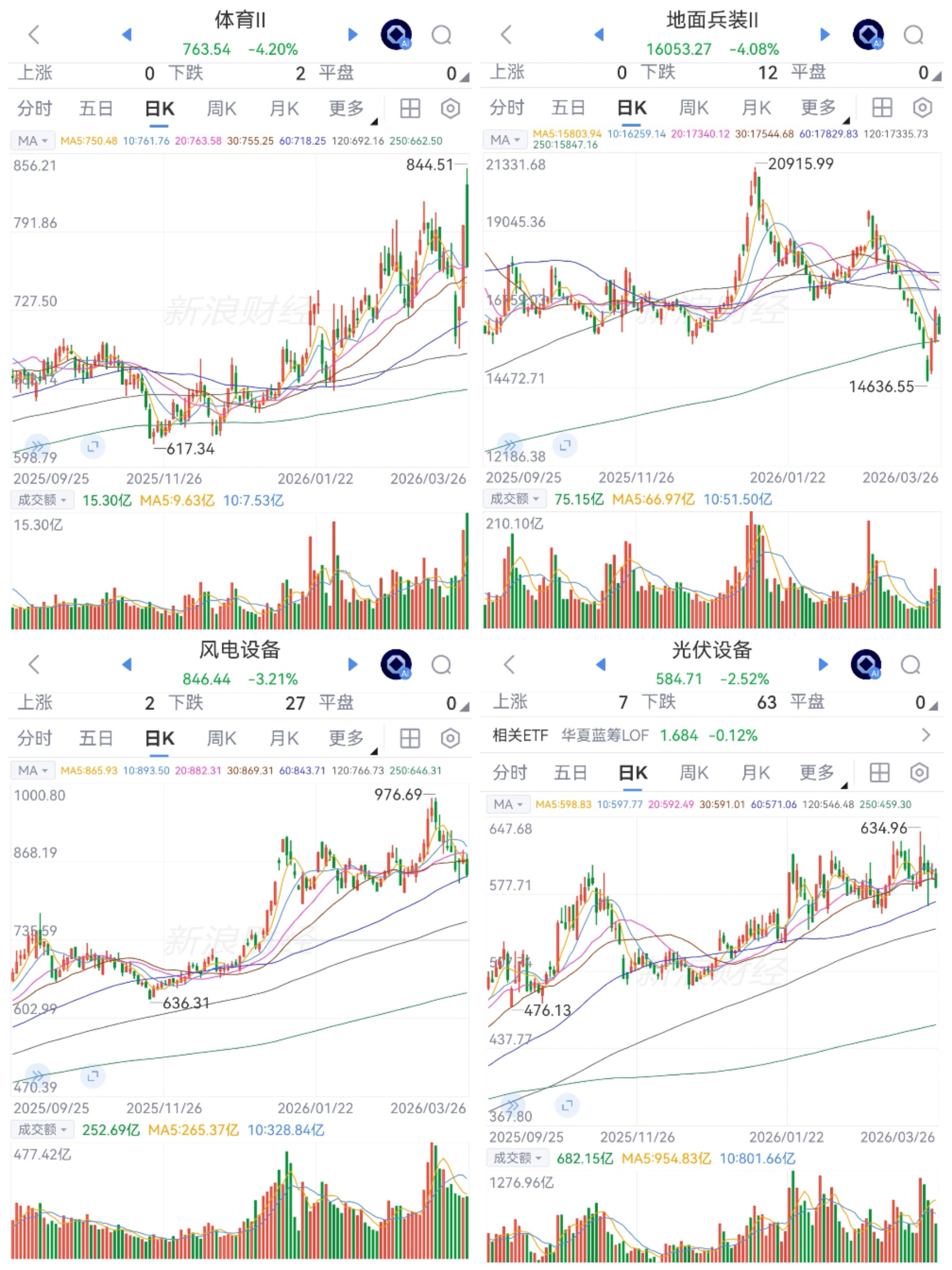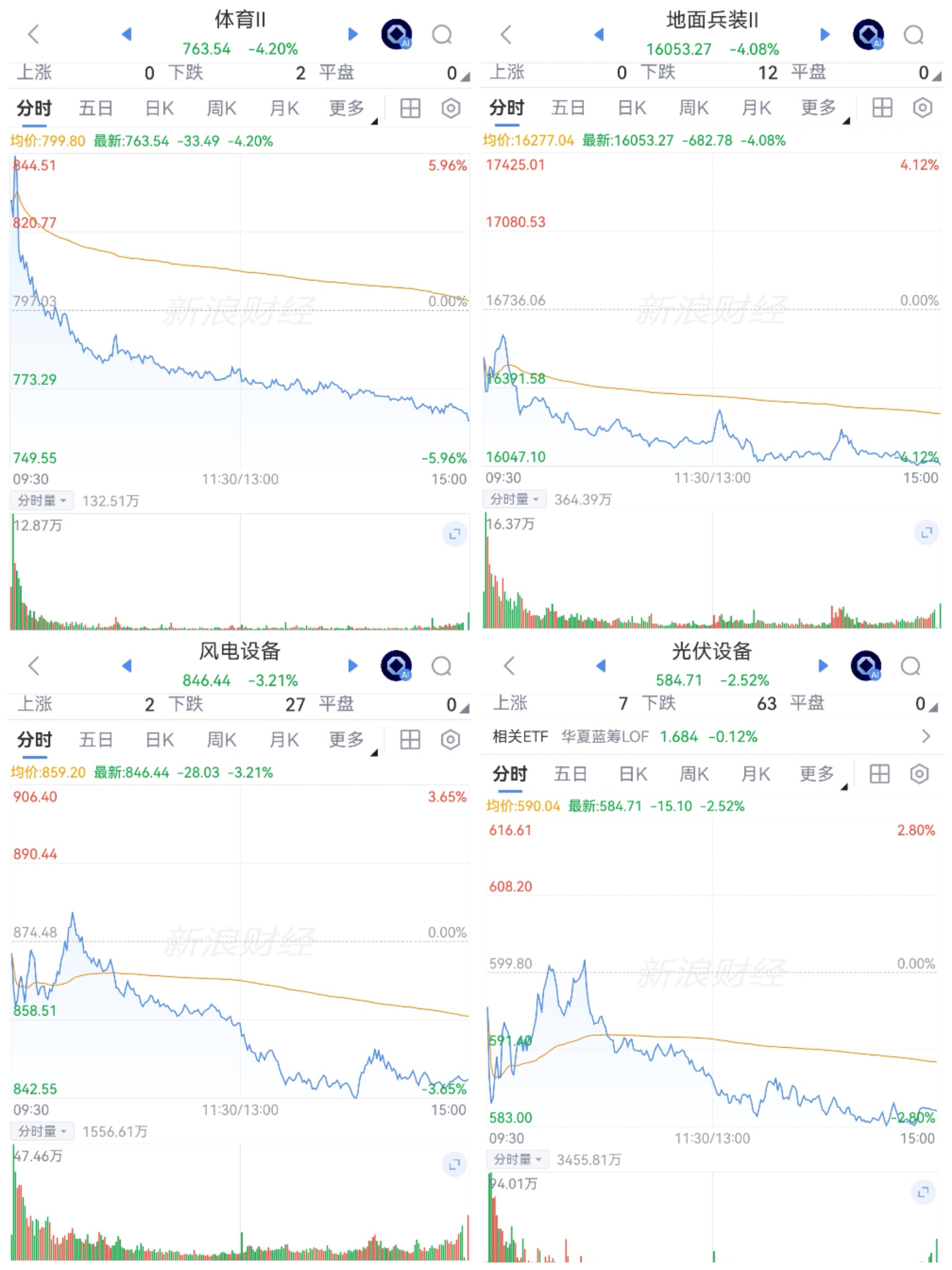 体育、兵装、风电和光伏低迷调整。开盘上扬又跳水,新能源抵抗30余分钟也跳水,下行至午后,低位震荡,收盘大跌,兵装连续强势后调整,风电和光伏震荡中。