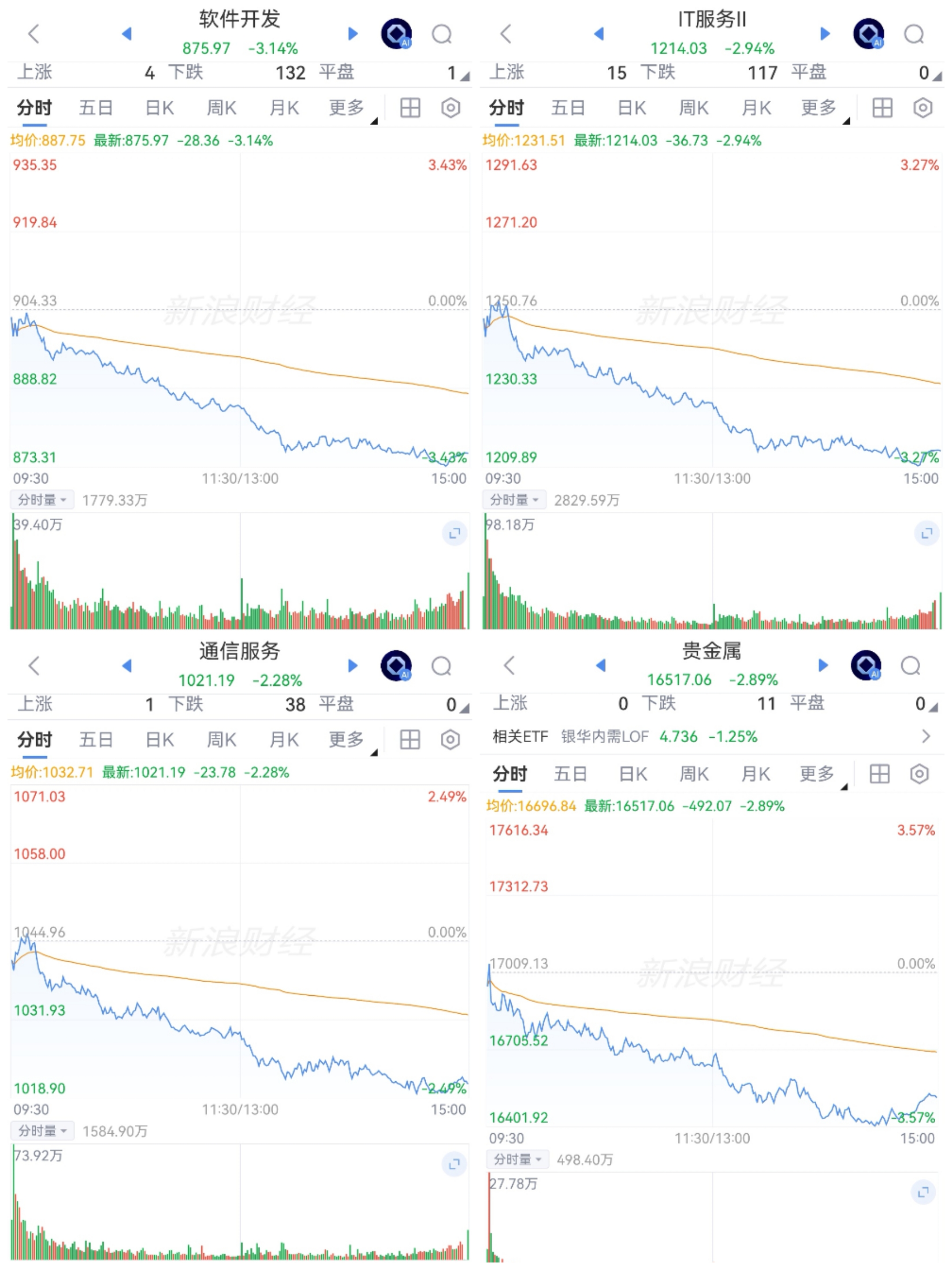 信安、通信服务和贵金属弱势调整。开盘稍震荡,转瞬又下跌,斜线至午后,低位震荡,跌幅也可观,数据中心、算力等弱势调整中,黄金上蹿下跳,变换未定。