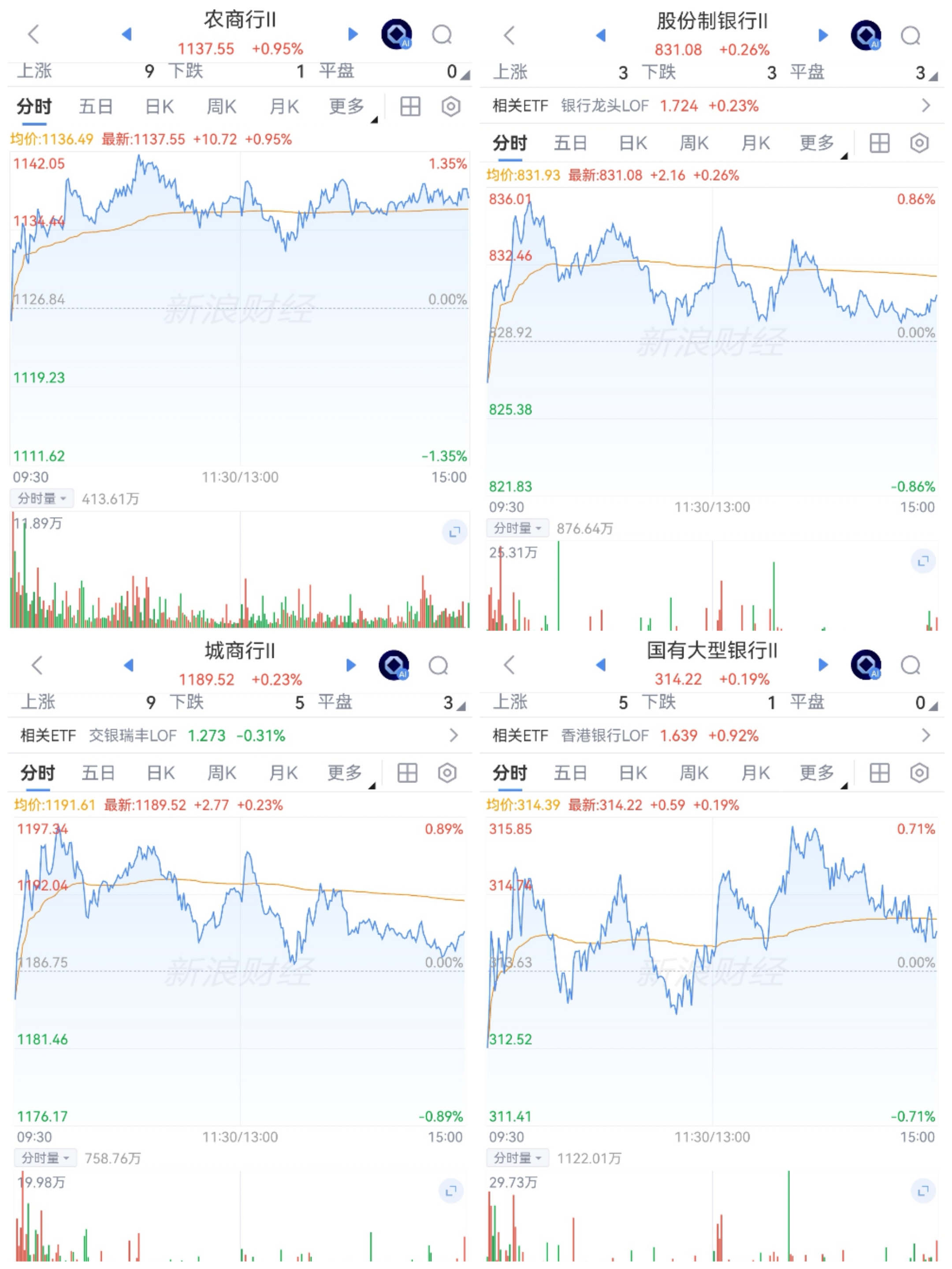 红利、银行。红利分化,银行护盘。银行低开拉升,红盘震荡,锯齿波动,微涨或多数微红,对冲科技低迷。
