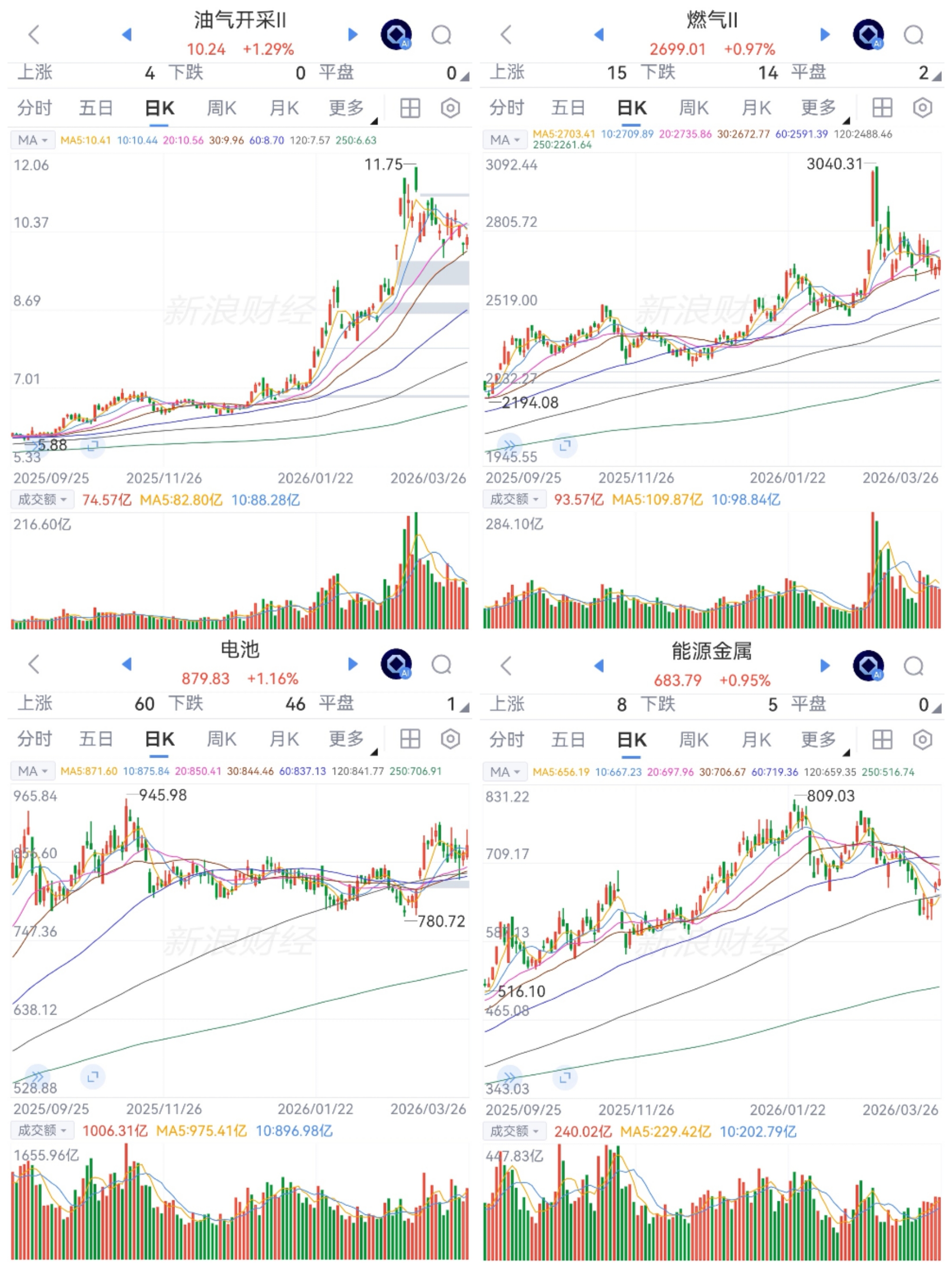 油气燃气和电池能源金属逆势活跃。化石能源上下波动又跳水,早盘中段拉起,上行至午后高位震荡,微涨报收;新能源和储能,低开拉升,高点后回落又震荡,收盘微涨;受大盘拖累,但个股强势更胜板块。战事迷雾中,化石能源波动,新能源替代强势中。