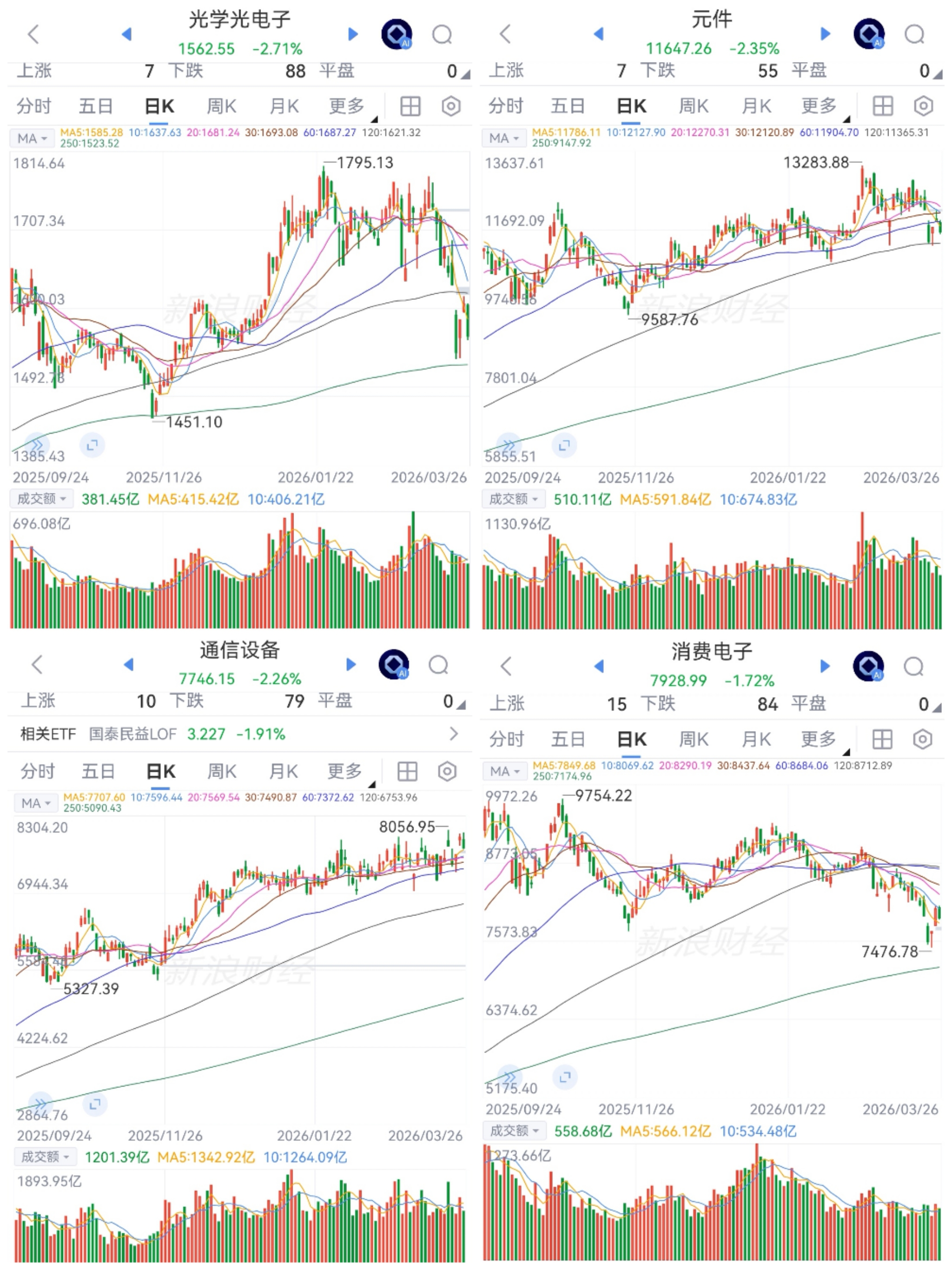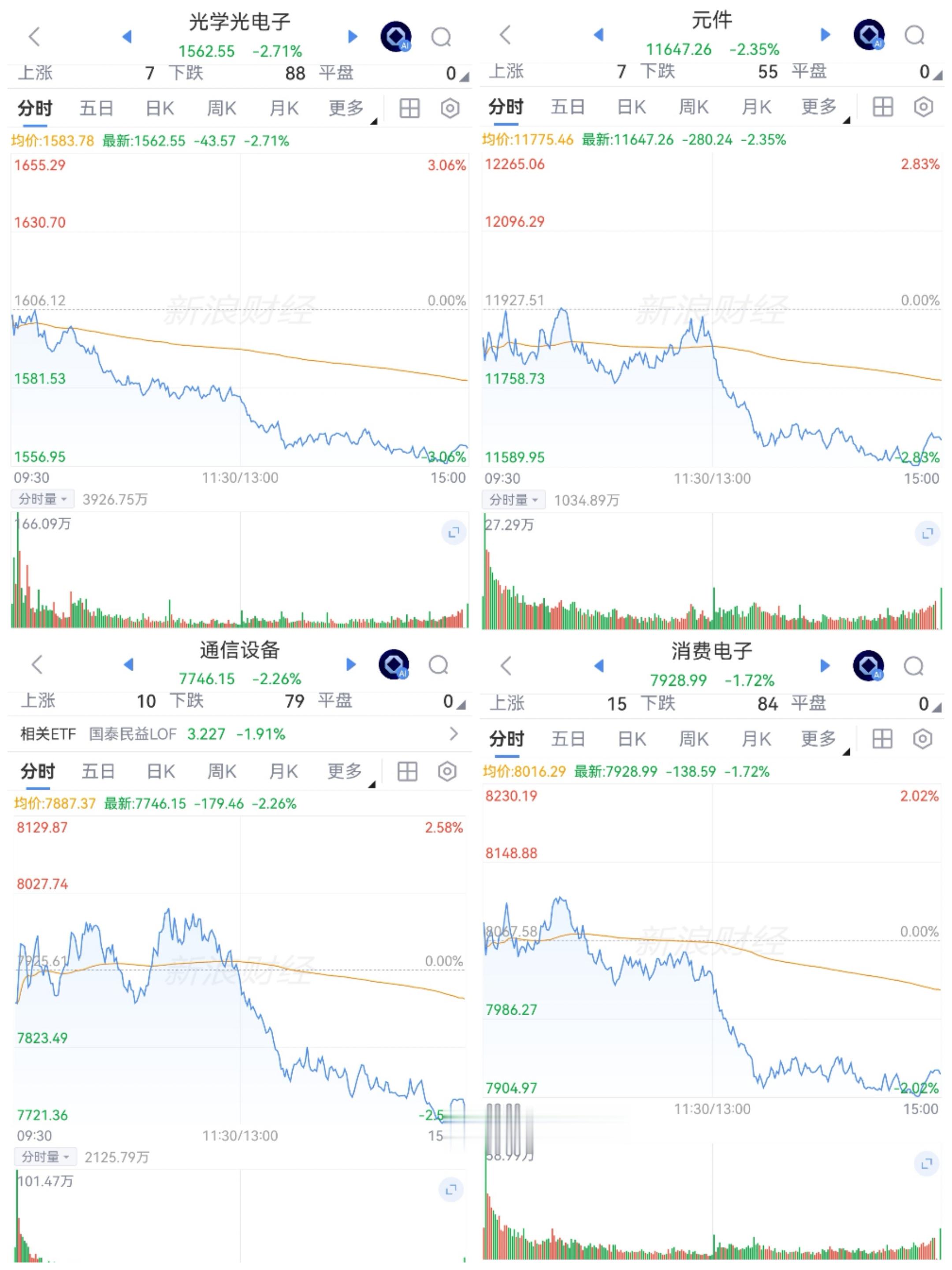 5G和消费电子走势分化。板块全部净卖出。通信设备、元件高点附近震荡;消费电子、光电子又冲向下方的250日均线。