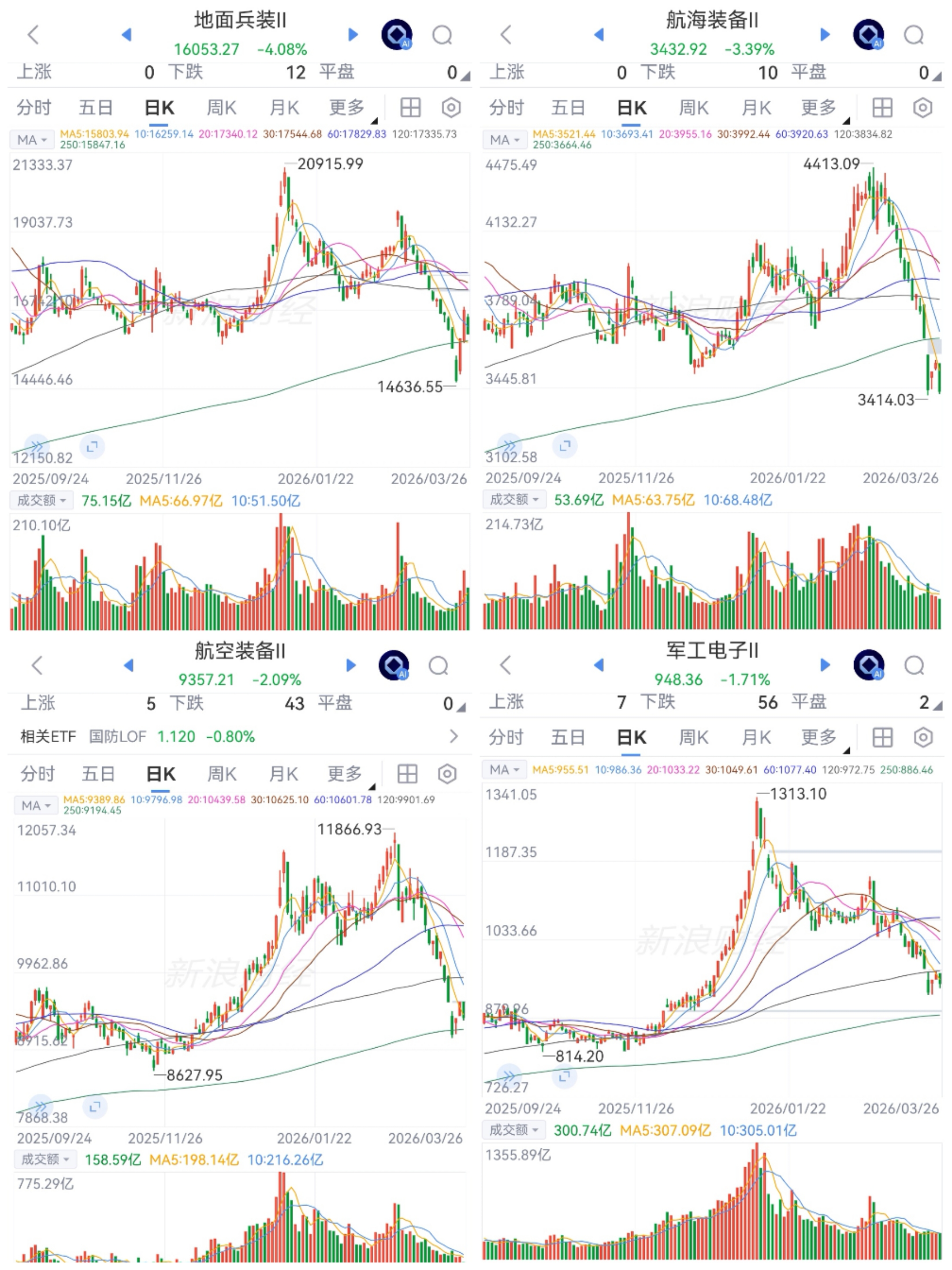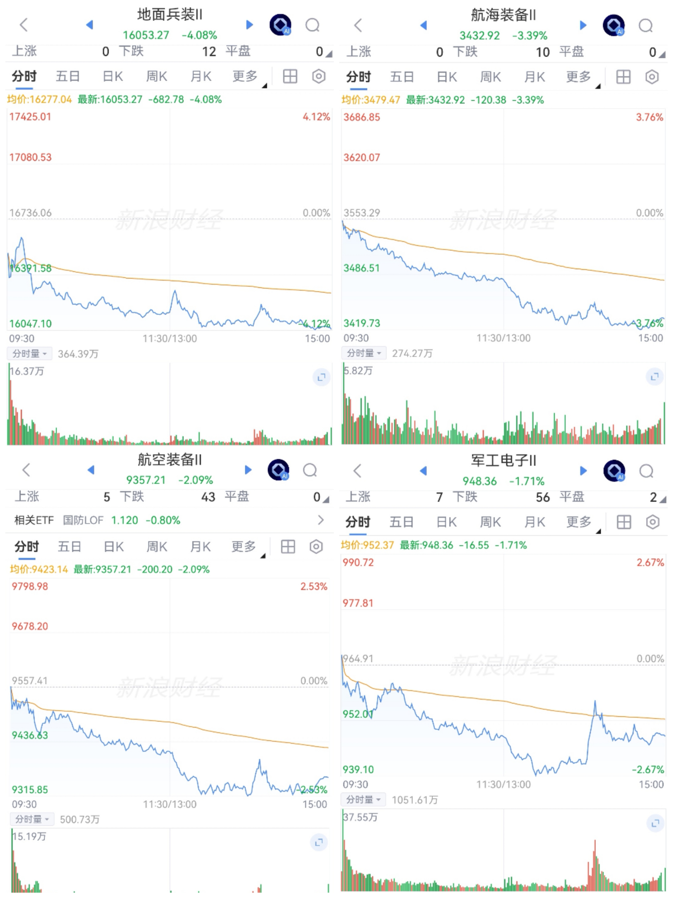 国防军工大幅回调。板块连续净卖出,航天已连续6天;板块大幅震荡回调探底中。