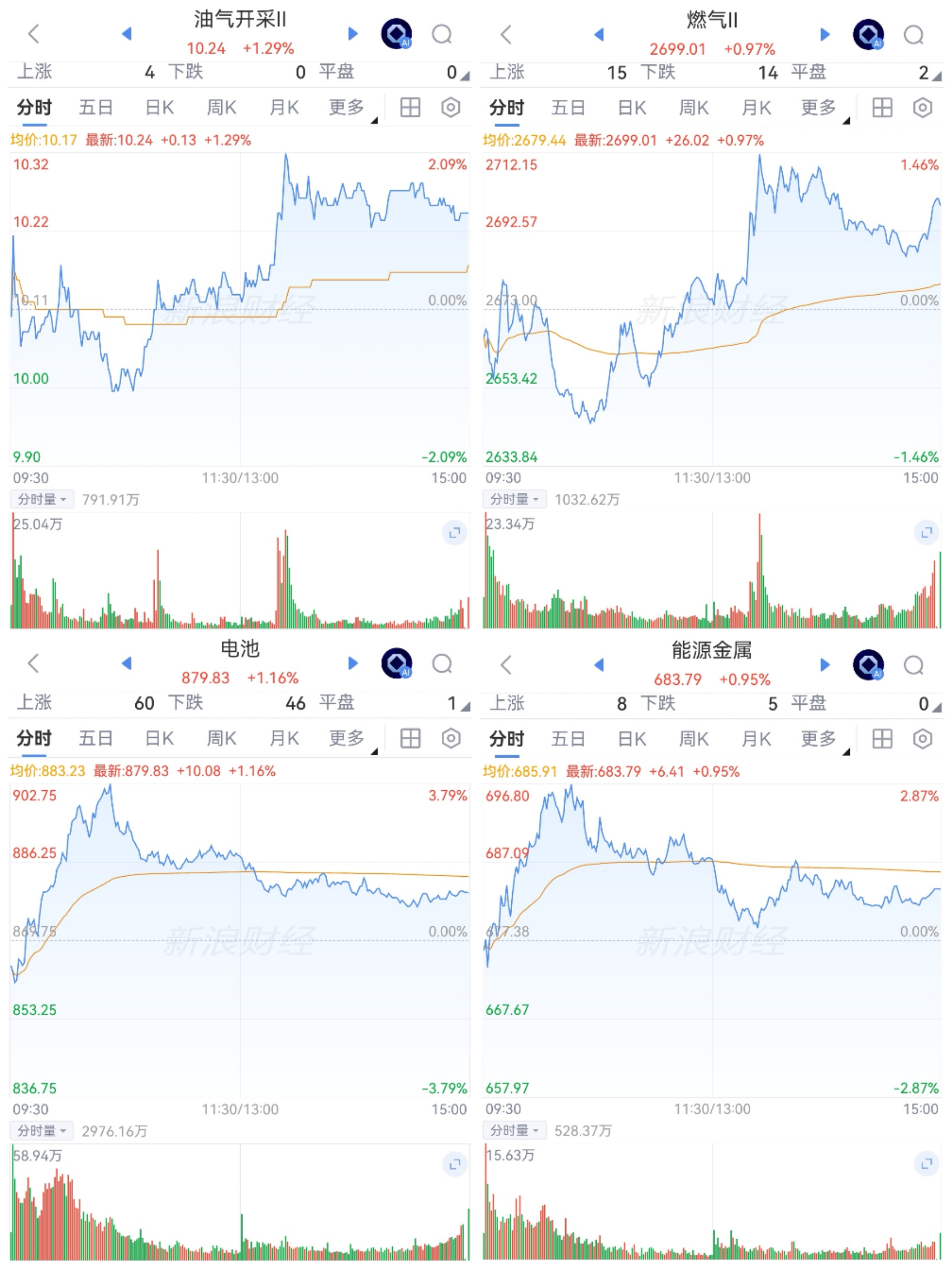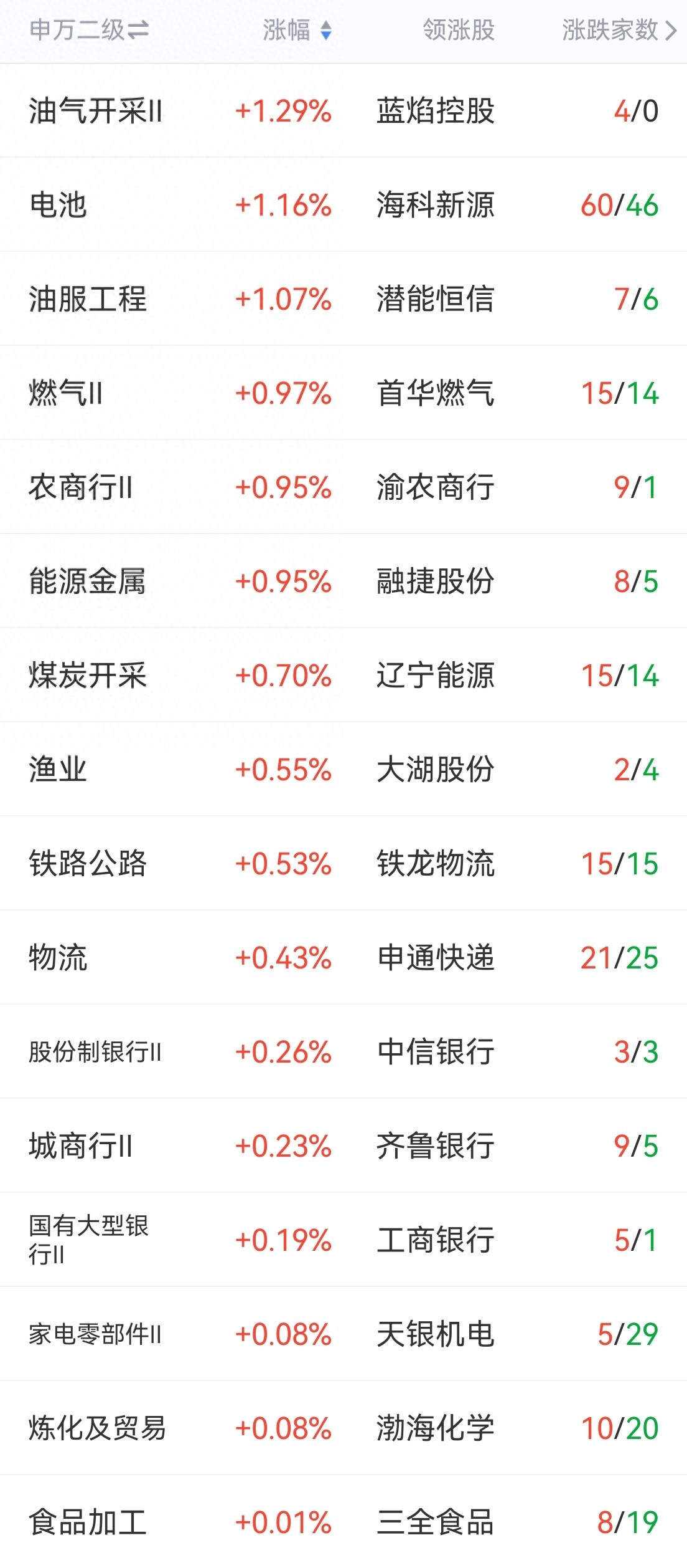 涨幅居前板块传统产业中的油气油服、煤炭炼化燃气、银行、能源金属、渔业、食品加工、交通运输和物流、家电零部件等,热点中的新能源(电池)等涨幅居前。