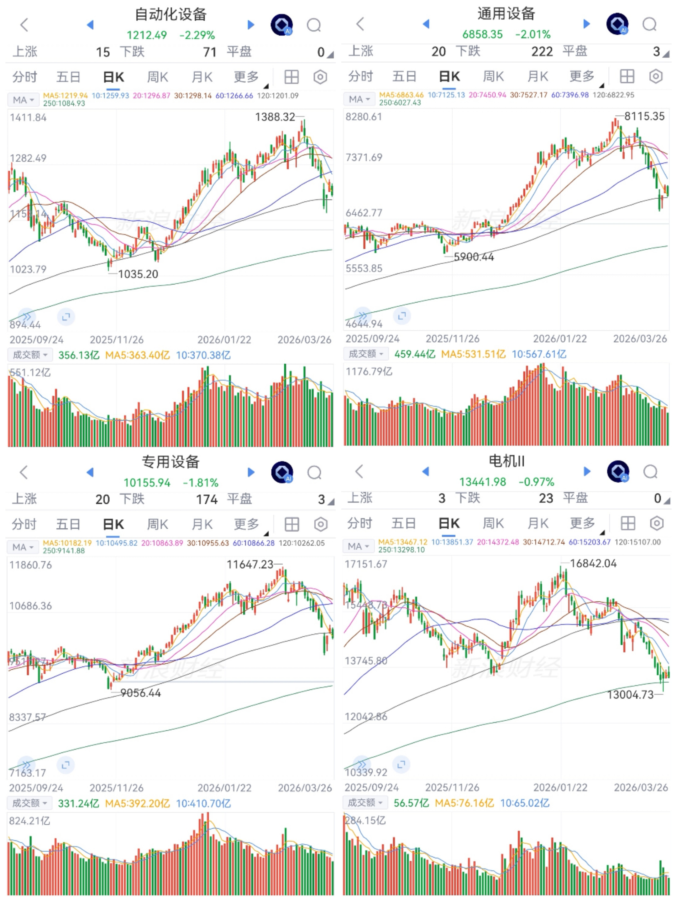 智能制造震荡调整。板块全部净卖出。自动化、通用和专用连创新高后回调,120日均线附近,电机接近前高后大幅回调跌至250日均线上方。