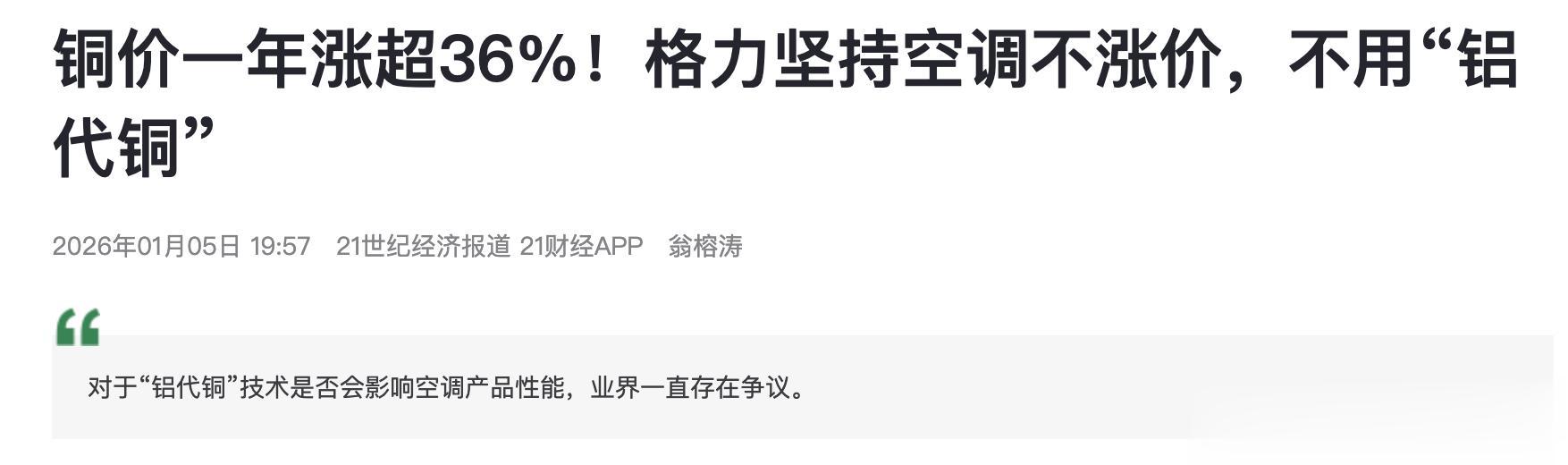 把好铜省下来,让给新能源和AI这些战略产业,是目前的必然要求。家电等传统制造业,通过技术迭代,用储量更丰富、价格更稳定的铝来替代部分铜,顺应了宏观大局。业内专家也表示,从工程技术角度看,合格的铝代铜并不会影响家电的日常使用和安全。