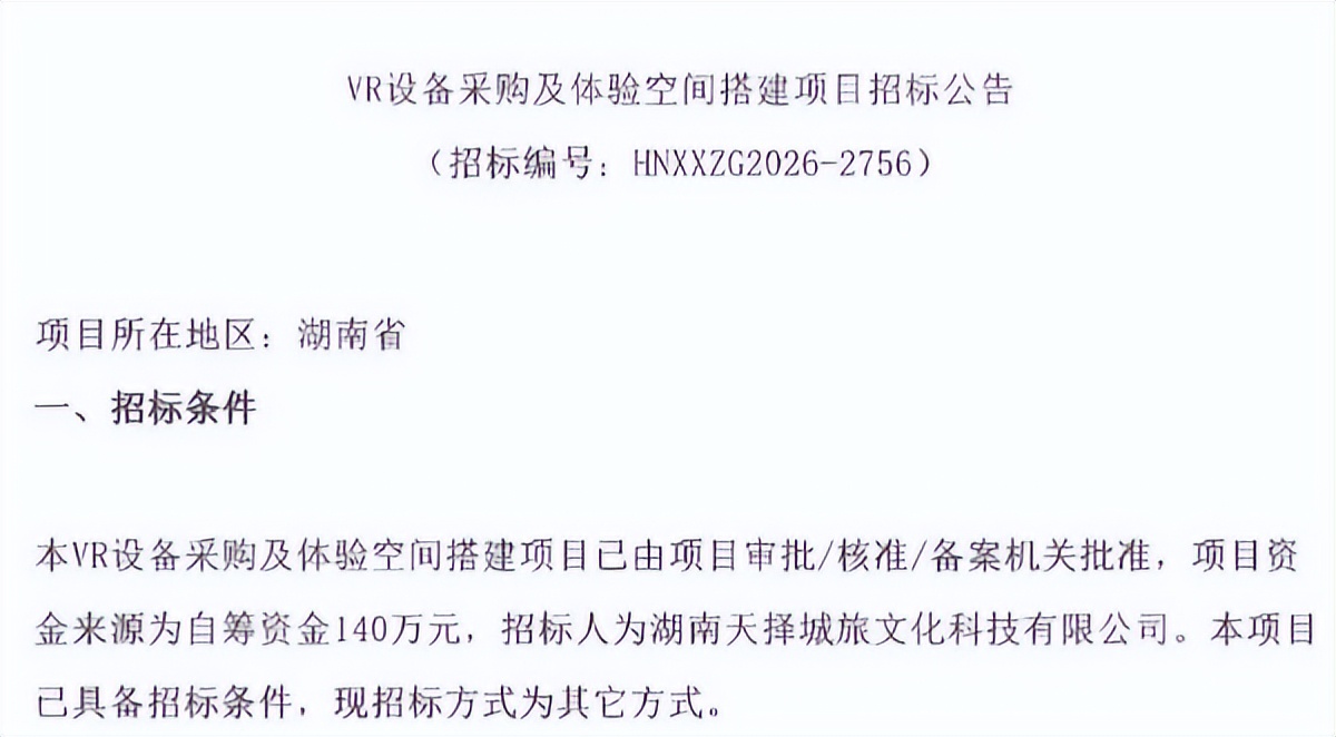 3月18日,相关招标信息显示,VR设备采购及体验空间搭建项目采购公告对外发布。