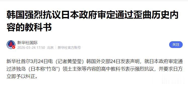 几乎同一时间,韩国外交部发表声明,就教科书歪曲历史、侵犯领土主权的行为向日方发出强烈抗议,并召见日本驻韩使馆公使当面传达严正立场。