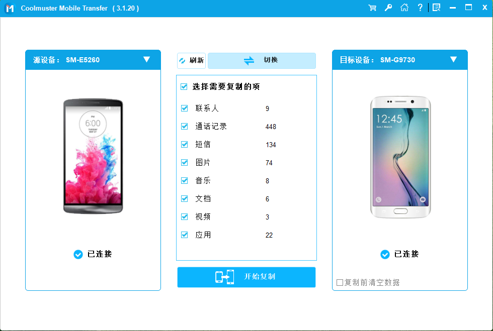 有一个工具可以帮助您直接在 Vivo 之间传输数据。那就是 Coolmuster Mobile Transfer ,一款软件应用程序。它可以通过 USB 或 Wi-Fi(具体取决于您喜欢的连接方式)将所有数据从源 Vivo 设备复制到另一台设备。有了它,您可以同时移动联系人、用户应用、视频、音乐、照片、短信等。