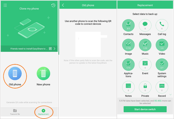 步骤 2.在源设备上,选择位于右下角的 “替换” 功能,然后选择 “旧手机”。