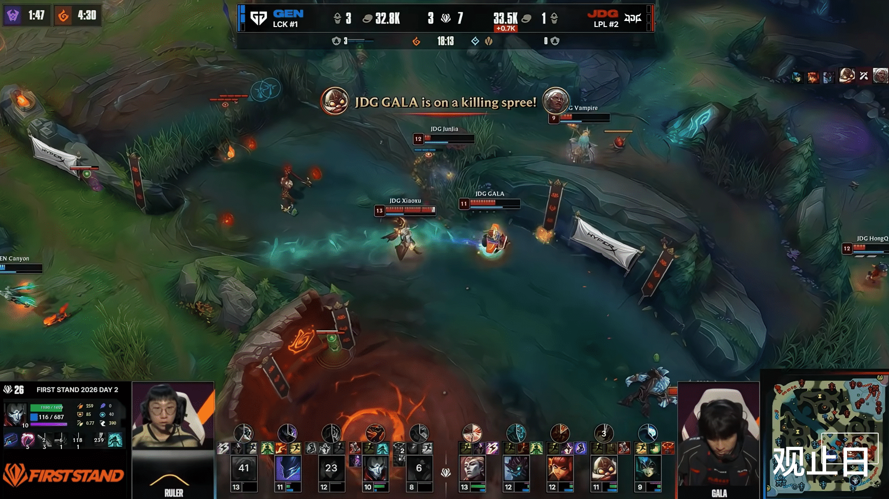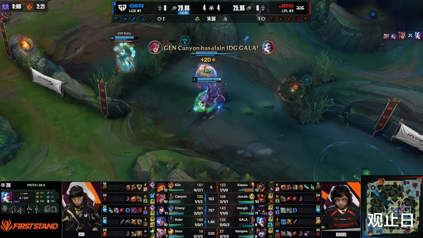中期Xiaoxu鳄鱼虽然单杀Kiin纳尔,稍微打回一点,但GEN的经济优势已经滚到无法挽回。24分钟,GEN再下一城。