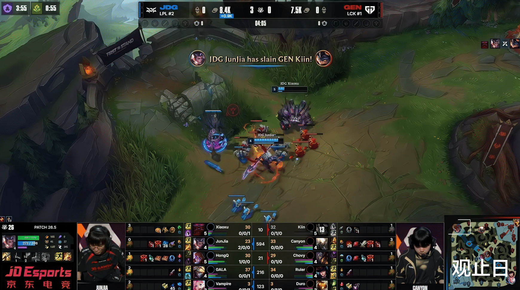 第一局JDG开局堪称完美:3分钟Junjia赵信下路拿一血,HongQ兔子单杀Chovy卡牌,Junjia又去上路抓死Kiin兰博,人头3-0开局。