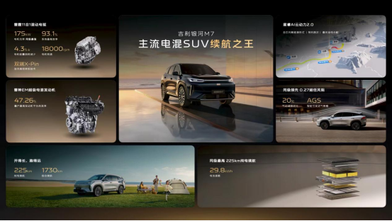 在能耗优化上,银河M7凭借多重核心技术,实现续航与油耗的双重最优,彻底告别续航焦虑。新车搭载热效率47.26%的雷神EM超级电混发动机,搭配系统效率93.1%的雷霆11合1高集成电驱,再加上0.27Cd同级超低风阻系数,从源头降低能耗;星睿AI云动力2.0系统更是能耗优化的核心,行业首发无图决策功能可智能匹配惯用路线做全局能量规划,还能根据路况自主判断能源形式、实现智能油电分配,让每一度电、每一滴油都发挥最大价值,最终实现满油满电1730km同级最长综合续航,再搭配神盾金砖电池带来的225km同级最高纯电续航,日常通勤可实现零油耗,长途出行也无需频繁补能。