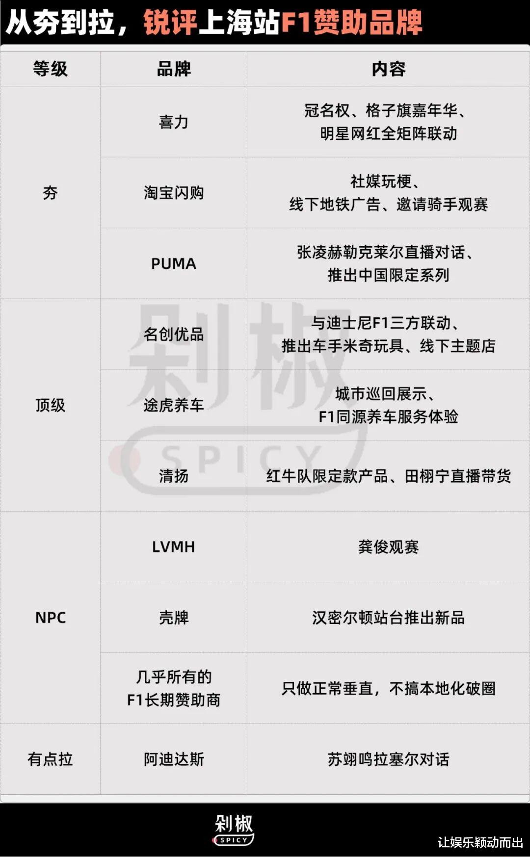 据此,剁椒Spicy在F1上海站尾声观察,推出一份纯主观的从夯到拉锐评F1中国区品牌合作赞助效果列表。评价标准分别是:话题出圈度,品牌形象塑造和本地化策略高明度。