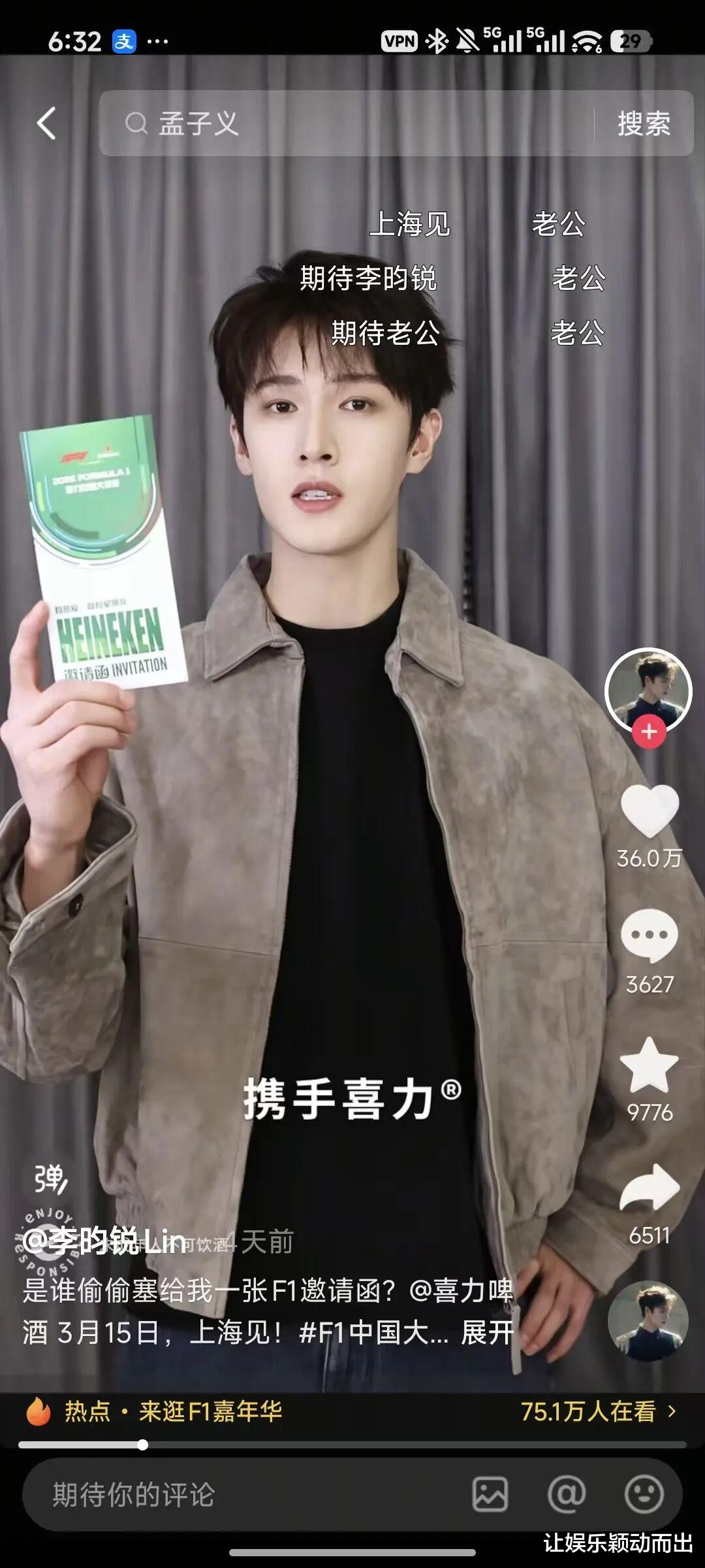 除了线下,喜力在线上也持续发力。在抖音推出了“喜力F1星朋友”话题,邀请李昀锐为赛事造势,又邀请吴彦祖观赛,把原本不属于F1赛场的本地流量,也请到了场内。
