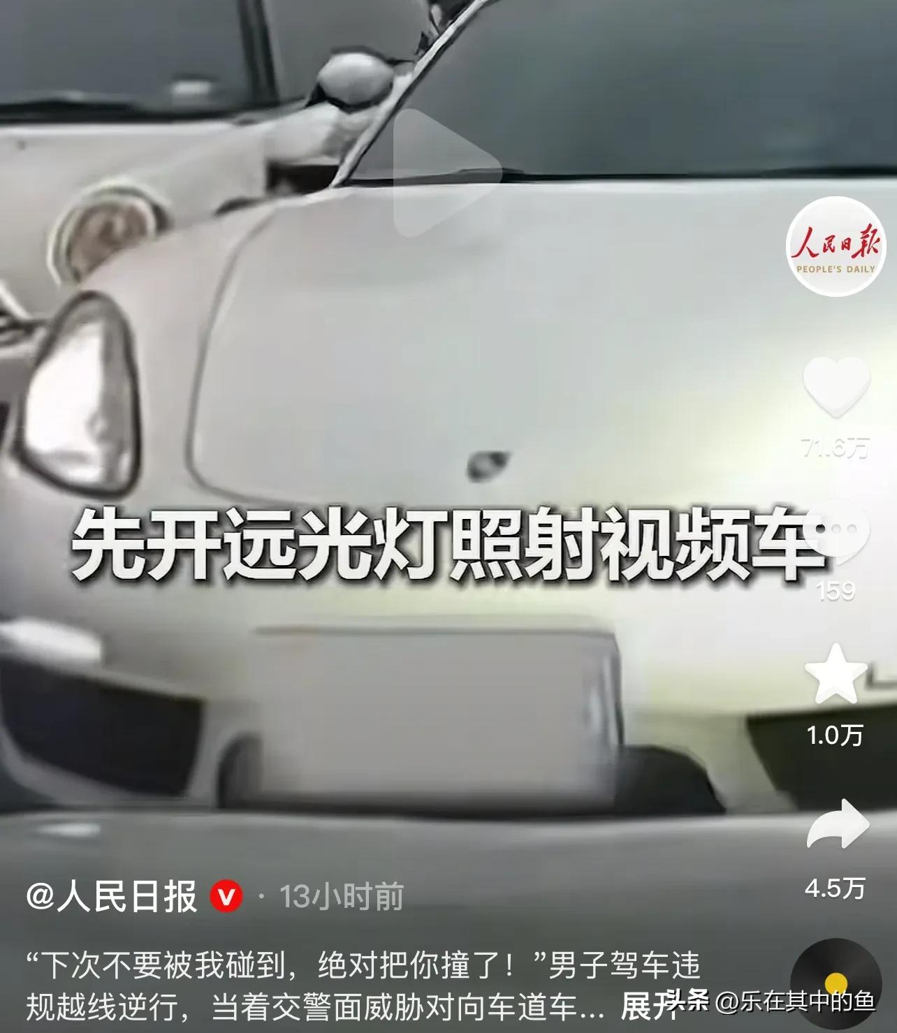 可还没过一会,对面一辆白色的保时捷打着刺眼的远光灯,直直地就逆行过来了。